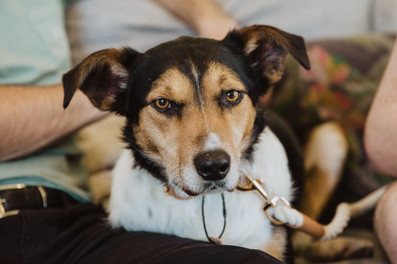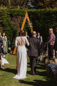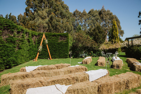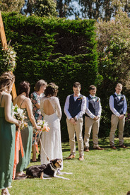 The lawn at the far was set up with bay bales & an arch. Toby the dog walked down the aisle too! It was a beautiful ceremony followed by lawn games and drinks in the garden surrounded by blossom trees!